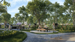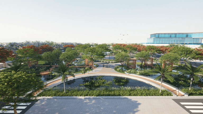 - Công viên cây xanh, đường dạo bộ, bến du thuyền.
