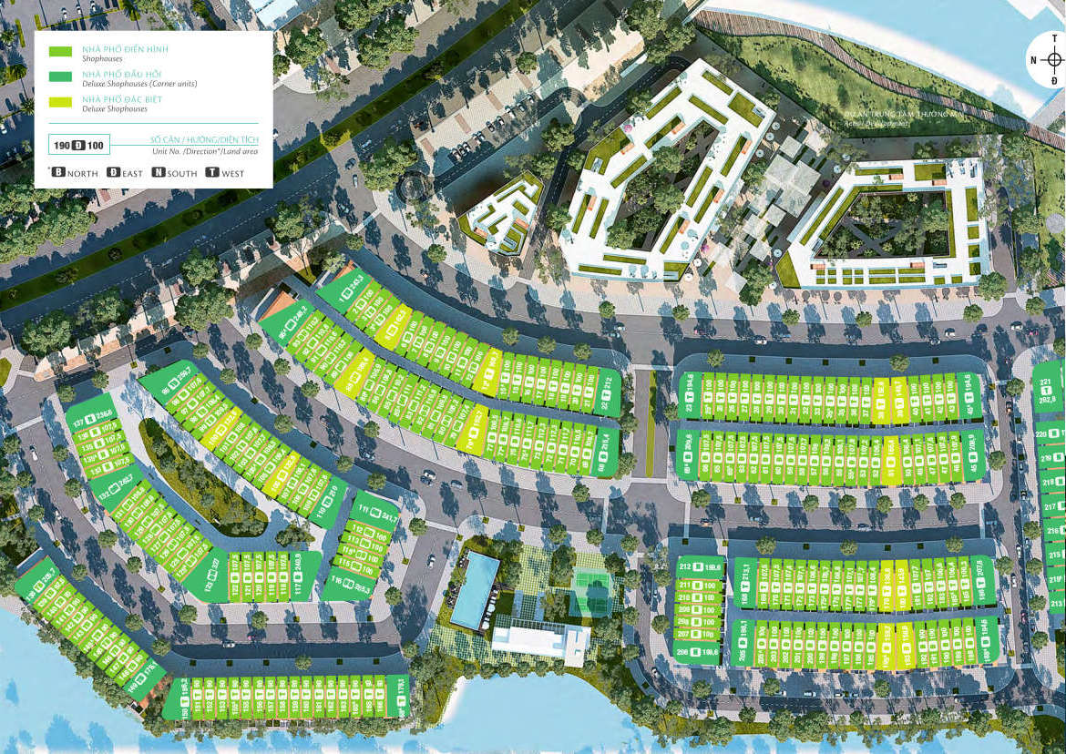 - Nhà phố điển hình: 173 căn, diện tích 90 – 112m²